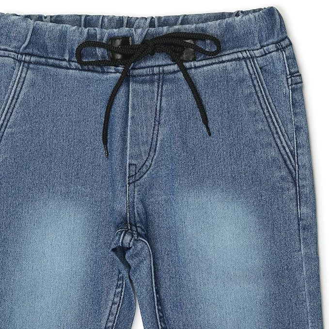 Stylish Washed Light Blue Jogger Jeans for Boys - Comfortable Elasticized Waistband with Drawstring and Elasticized Hem Cotton Lycra with Stretch (98% Cotton 2% Elastane) - Offers extra comfort and flexibility Slim Fit; Mid-Rise; Regular Length; Diagonal Front Pockets Perfect for Casual, Party & Evening Wear