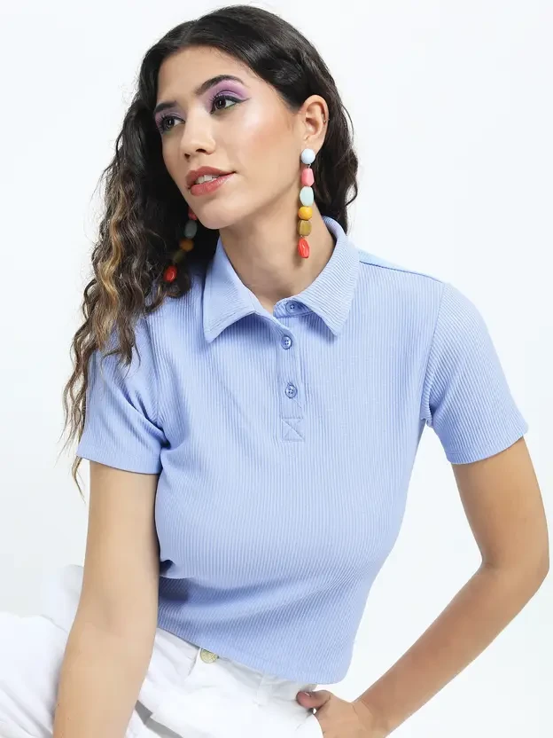 Neck Collared Sleeve Style Regular Sleeves Sleeve Length Short Sleeve Fit Regular Fabric Cotton Blend Type Crop Top Pattern Solid Color Blue