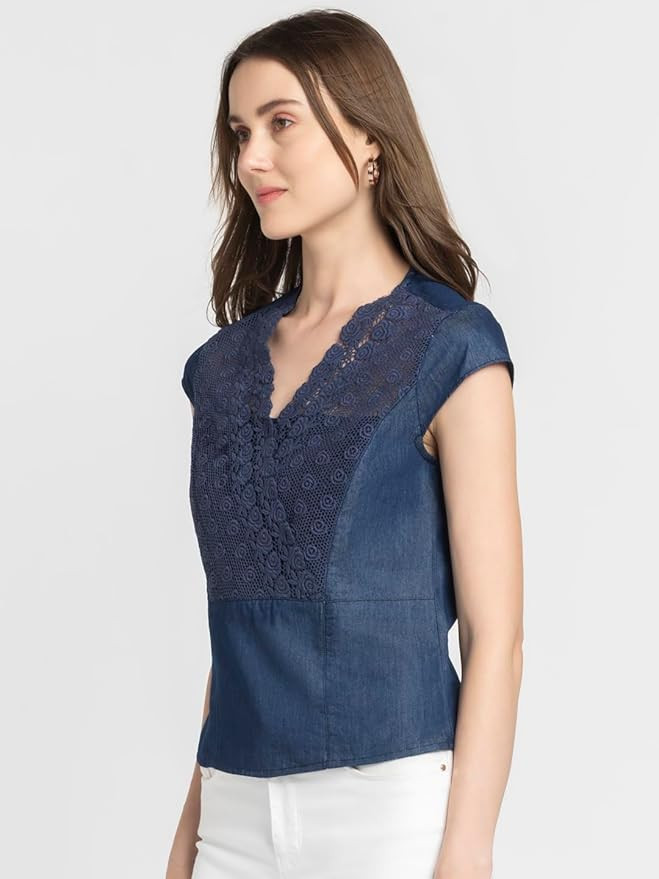 Blue v-neck short cap sleeves denim top has lace embroidery on front and overlap detail The flattering V-neckline adds a touch of sophistication, while the short cap sleeves provide just the right amount of coverage for warmer days. Whether paired with your favorite jeans for a casual outing or dressed up with a skirt for a night on the town, this top is sure to turn heads wherever you go.