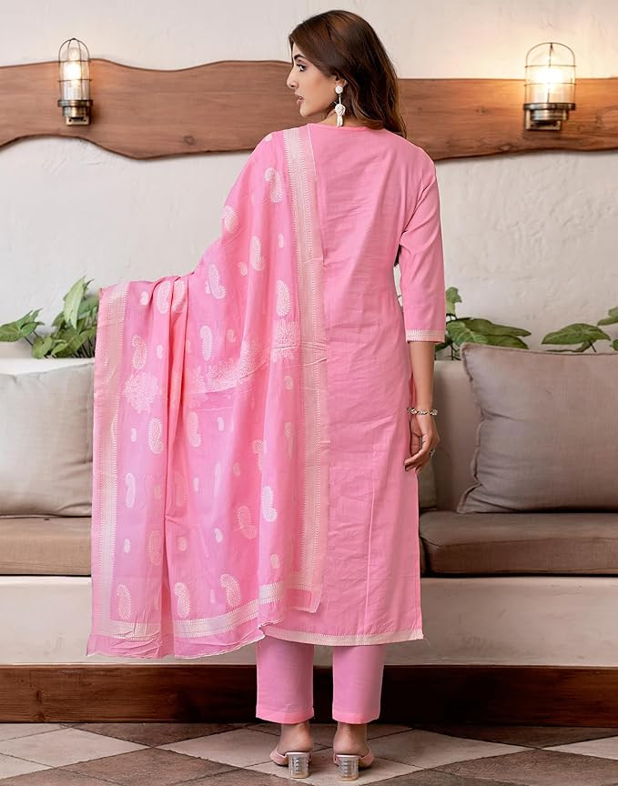 Kurta Fabric:: Cotton | Kurta Work:: Jacquard ||Pant Fabric::Cotton | Pant Work::Solid (With Pocket) || Dupatta Fabric:: Cotton| Dupatta Work:: Solid, Jaquard Kurta Color:: Off White || Pant Color::Off White || Dupatta Color:: Off White, Dark Magenta Readymade outfit kurta Set that offers convenience without compromising on style, Perfectly suited for all occasions, from spring and summer events to office and official settings.
